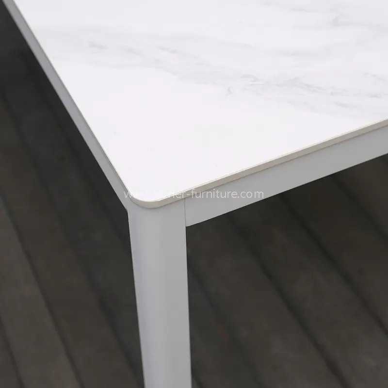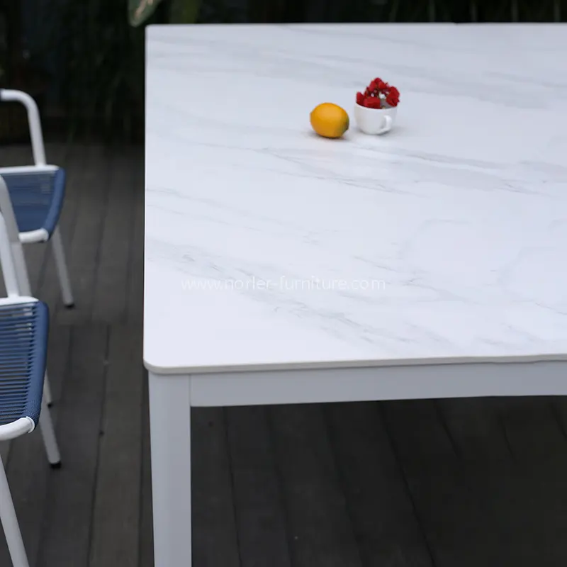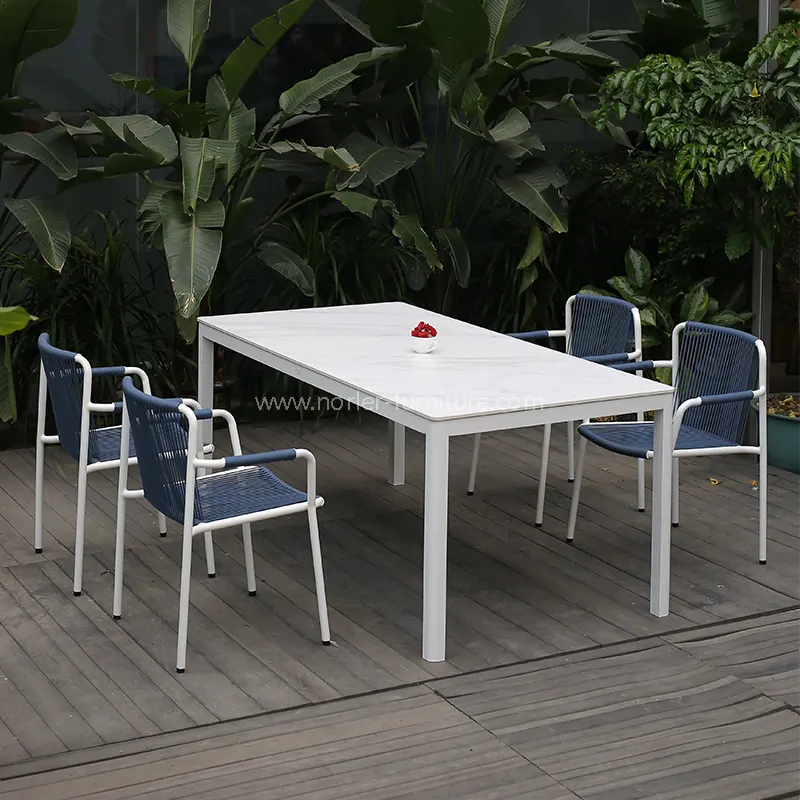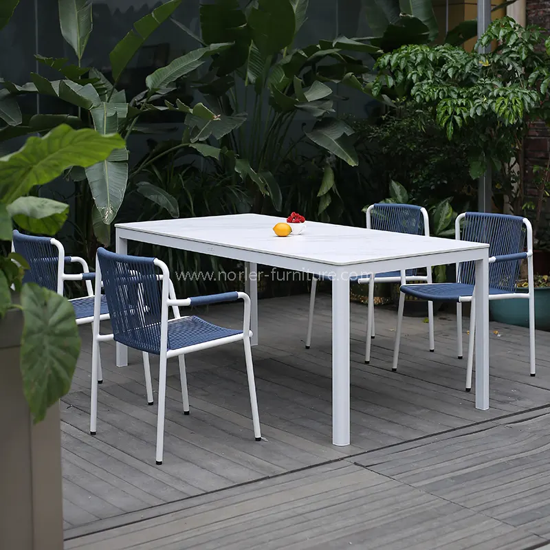 La cintura intrecciata in alluminio e la sedia esterna utilizzano una cornice in lega di alluminio ed è stata trattata con spruzzatura anticorrosiva. Ha un'eccellente resistenza alle intemperie e resistenza alla ruggine, rendendolo adatto per un uso esterno a lungo termine. La superficie del sedile utilizza cinture intrecciate ad alta resistenza, che sono elastiche e traspiranti, fornendo una sensazione di seduta comoda e non sono facili da deformare o età. Il tavolo è realizzato con lastre di roccia di alta qualità con una superficie liscia. È resistente alle alte temperature, ai graffi e ai raggi UV, rendendo facile da pulire e mantenere quotidianamente. La cintura intrecciata in alluminio tavolo da esterno e tavolo delle sedie da tavolo non è solo forte e resistente, ma migliora anche l'aspetto generale dei mobili!