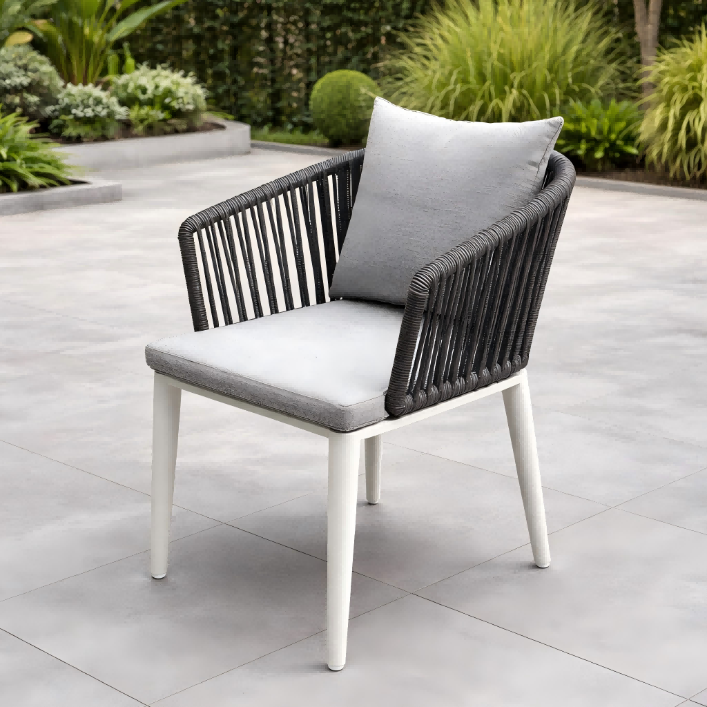Le sedie da pranzo sono caratterizzate da uno schienale in corda intrecciata, che crea un aspetto moderno ed elegante fornendo allo stesso tempo un supporto confortevole. Il telaio è realizzato in alluminio verniciato a polvere, che offre un'eccellente resistenza alla ruggine e alle condizioni atmosferiche esterne.